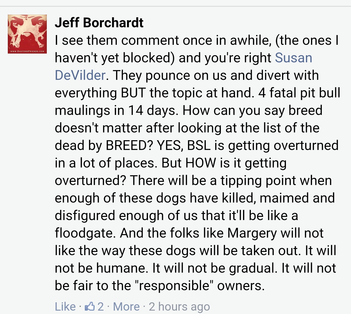 Jeff has five Facebook accounts he uses to stalk and cyber bully pit bull owners generally women and children.....